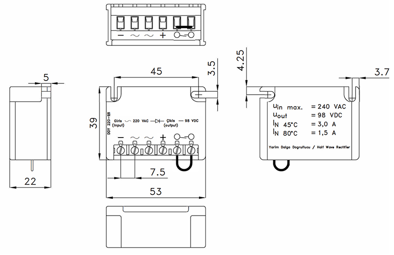 Home > Electronic Components > Rectifiers > Motor Brake Power > 6-Pole Half Wave Rectifier DDY220-98-6D Bridge Rectifier,Köprü doğrultucu,Brückengleichrichter