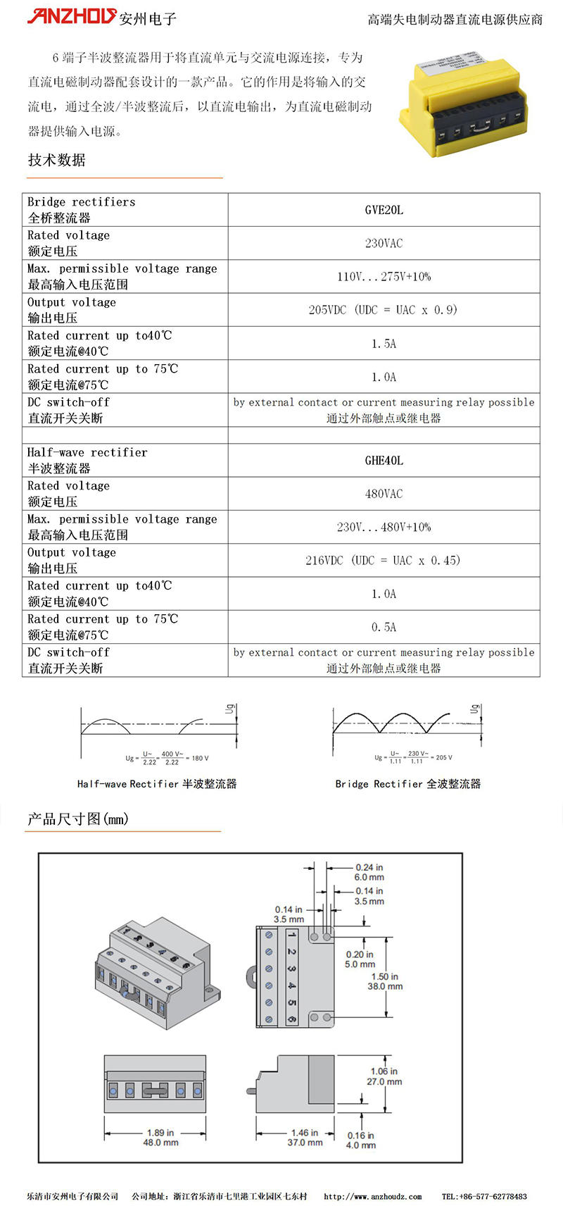 Technical Data Rectifier Model GVE20L Max.input Voltage (Uin) 575Vac.Max Input Voltage (Uout)Uin X 0,9 Vdc Rectifier Current (IN 45℃) 2.0A Rectifier Current (IN 80℃) 1.0A Example: 380V AC Input Voltage, 170V DC Coil Voltage Example: 220V AC Input Voltage, 99V DC Coil Voltage