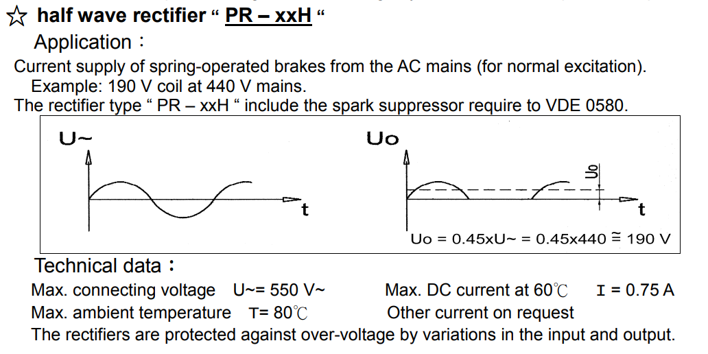 Technical Data Rectifier Model PR-15 Max.input Voltage (Uin) 550Vac.Max Input Voltage (Uout)Uin X 0,45 Vdc Rectifier Current (IN 45℃) 3.0A Rectifier Current (IN 80℃) 1.5A Example: 220V AC Input Voltage, 96V DC Coil Voltage Example: 440V AC Input Voltage, 190V DC Coil Voltage