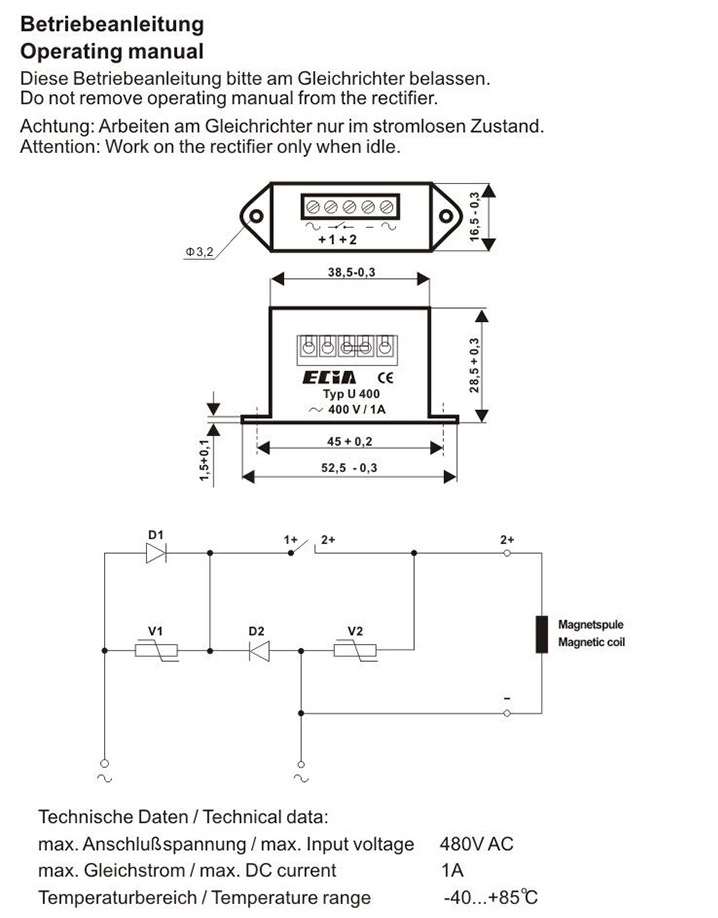 Rectifiers for Electromagnetic Brakes ECIA U400 400V1A Half-wave rectifier BRAKE 205VDC